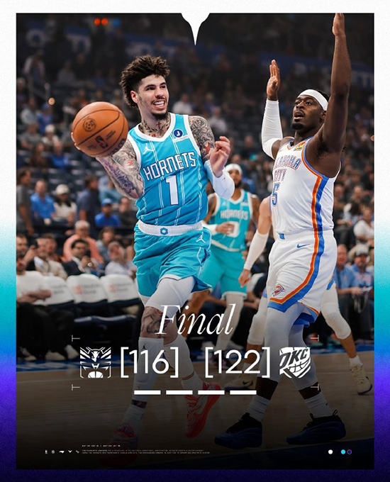 24直播网讯 北京时间10月10日 NBA季前赛,俄克拉荷马雷霆对阵夏洛特黄蜂。半场雷霆64-57黄蜂,最终雷霆122-116黄蜂。