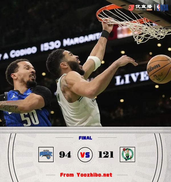 24直播网讯 北京时间1月18日NBA常规赛,半场凯尔特人66-54魔术,最终凯尔特人121-94魔术。凯尔特人塔图姆30分6板4助,波尔津吉斯23分4板1助;魔术科尔-安东尼23分7板,班凯罗21分4板4助。
