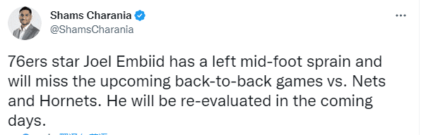24直播网11月22日,费城76人又遭重创,哈登、马克西之后,恩比德也伤停了,76人官方宣布恩比德因左中足扭伤将至少缺席接下来的两场比赛,76人三大球星都确定无缘对阵篮网;医学专家表示恩比德的伤情很棘手,平均缺席11场比赛。