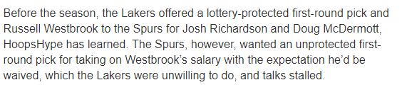 湖人想要交易威少早已不是什么秘密,今年休赛期,湖人曾积极推动交易威少,最终都已谈判失败而告终,湖人不想在威少交易中搭上首轮选秀权;本赛季开打前,湖人曾愿意搭上一个受保护首轮签把威少送到马刺,但交易仍以首轮签的问题而搁浅。
